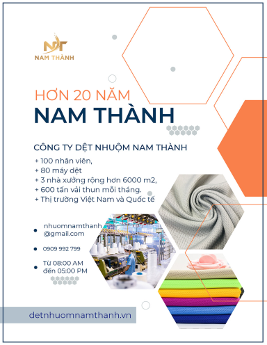 Công Ty Sản Xuất Vải Uy Tín Nam Thành Công ty dệt nhuộm Nam Thành có nhiều năm kinh nghiệm trong lĩnh vực sản xuất và cung cấp các loại vải thun ra cho thị trường Việt Nam và thế giới. Với 100 nhân viên, 80 máy dệt và 3 nhà xưởng rộng hơn 6000 m2, Nam Thành có thể đáp ứng hơn 600 tấn vải thun mỗi tháng cho thị trường.